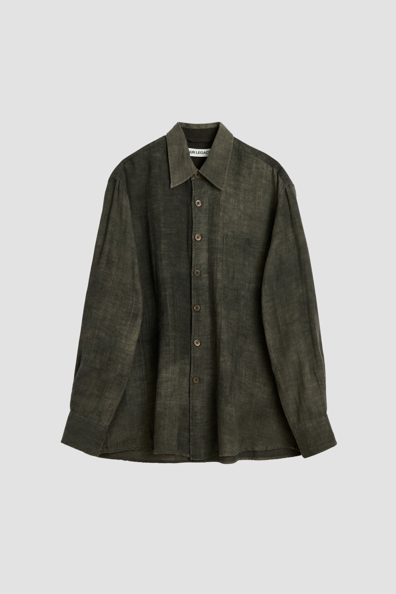 Structured shirt made from a loosely woven cotton-wool blend. Featuring a dark, cloudy gray colorway, a cropped, wide fit, raw-edged trims, and pearl buttons. A statement piece for layering.