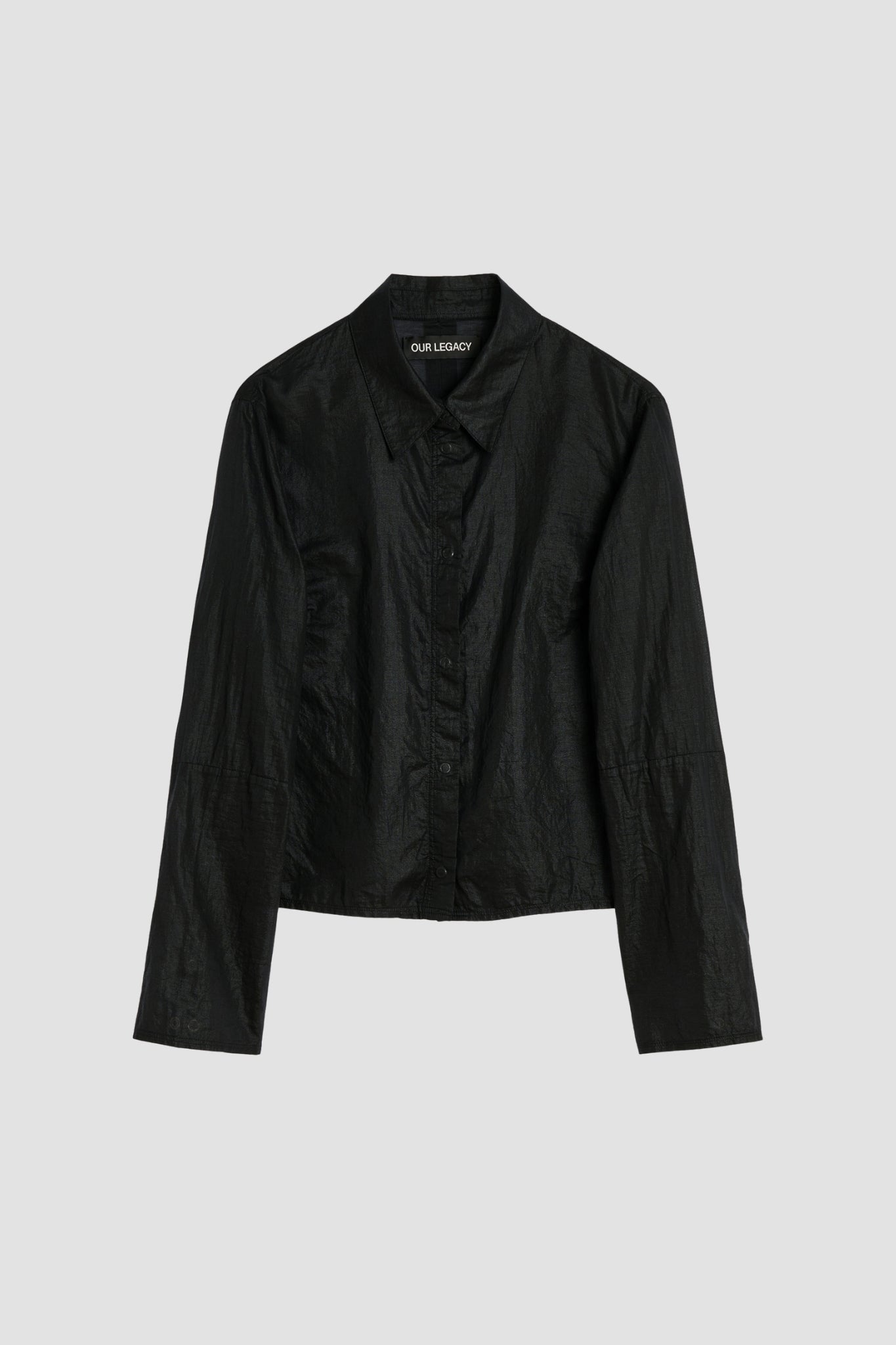 Chemise en mousseline de coton noir brillant avec un effet lustré subtil. Sa coupe boxy et ses finitions raffinées en font une pièce audacieuse.