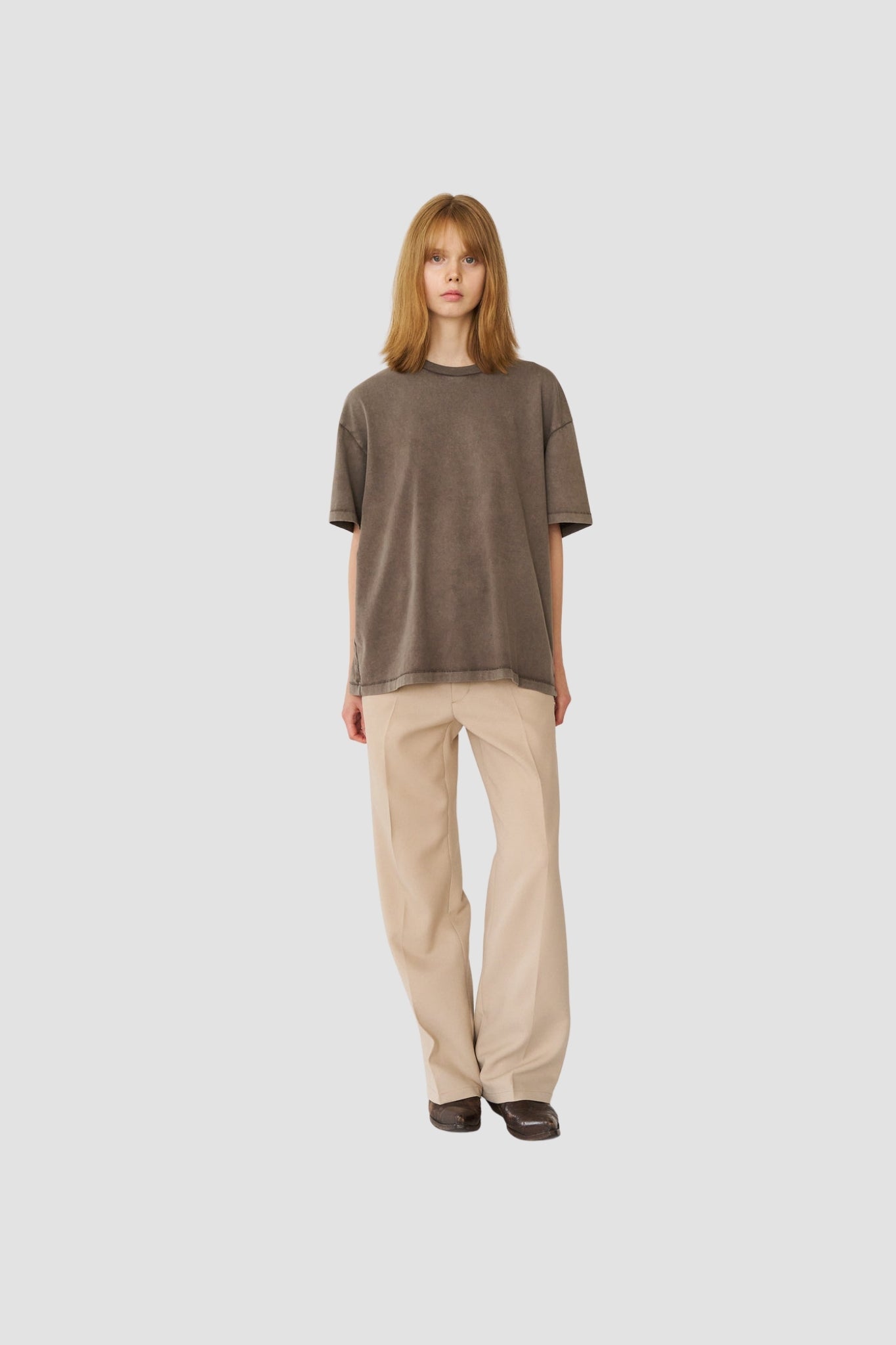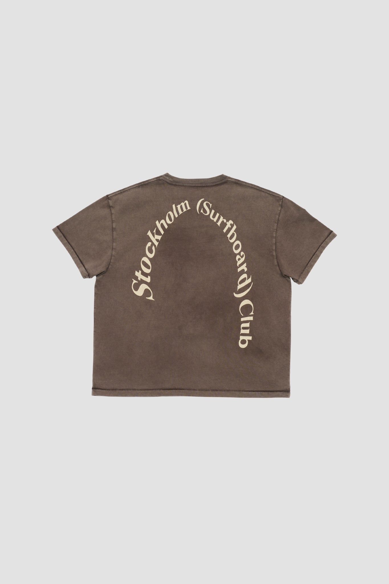 the BOX TEE BACK LOGO Hickory is Organic cotton boxy fit T-shirt with Stockholm Surfboard Club logo printed on the back. Hickory color for a timeless look.
