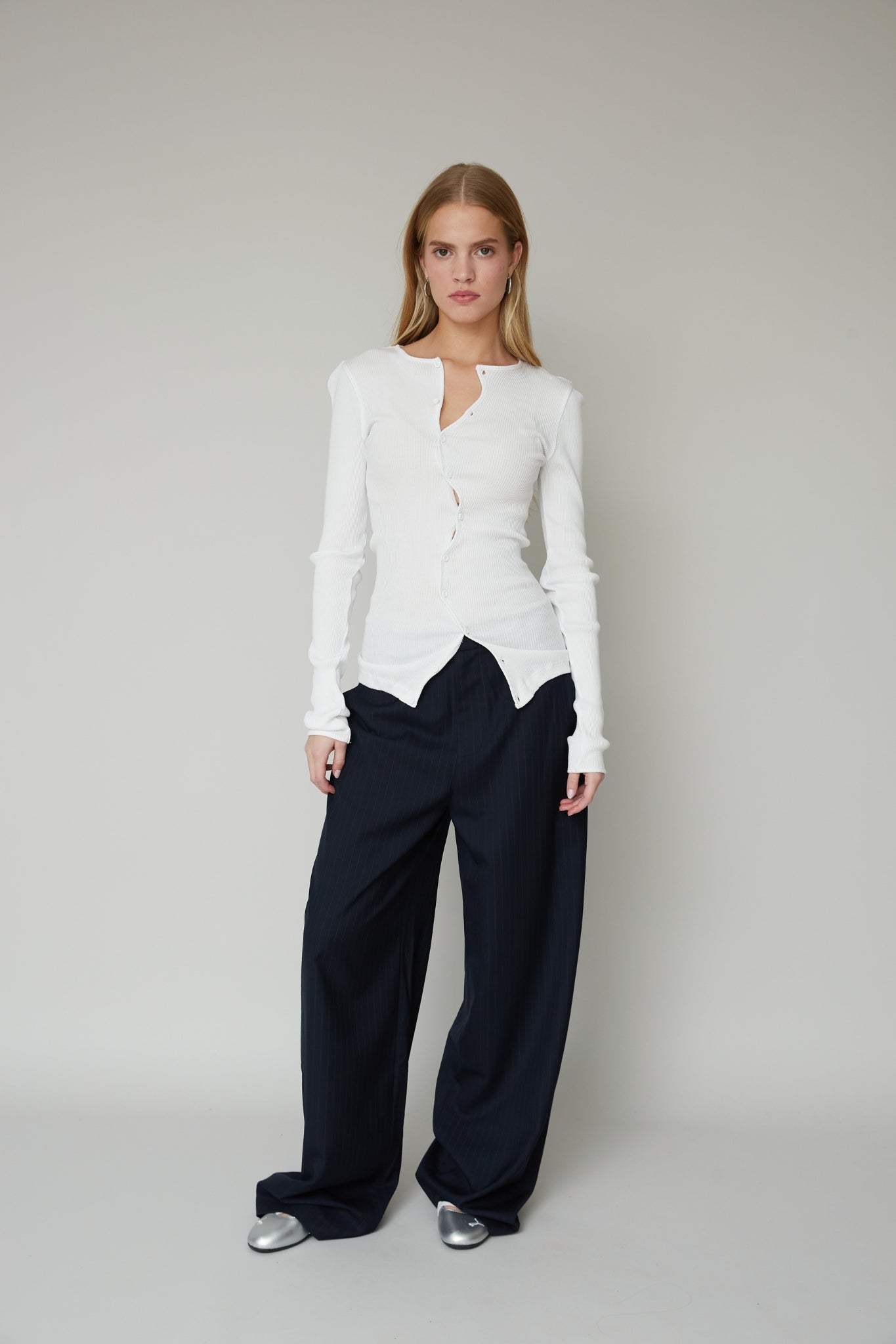 Le top Claire en maille seamless présente une coupe ajustée, un col rond et une fermeture avant asymetrique a bouton. Sa teinte blanche apporte une touche lumineuse et polyvalente.
