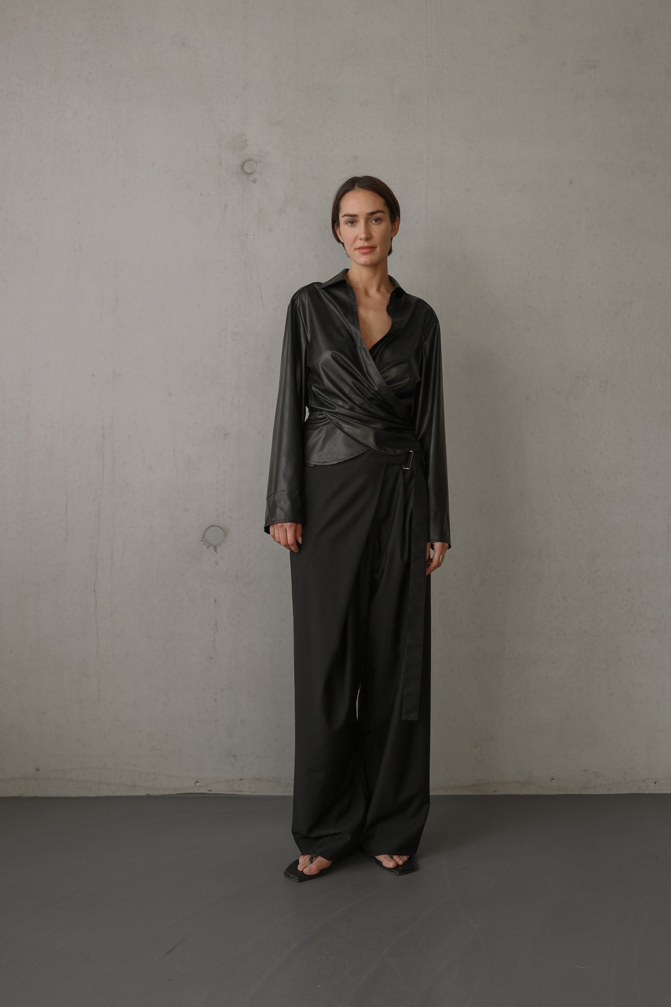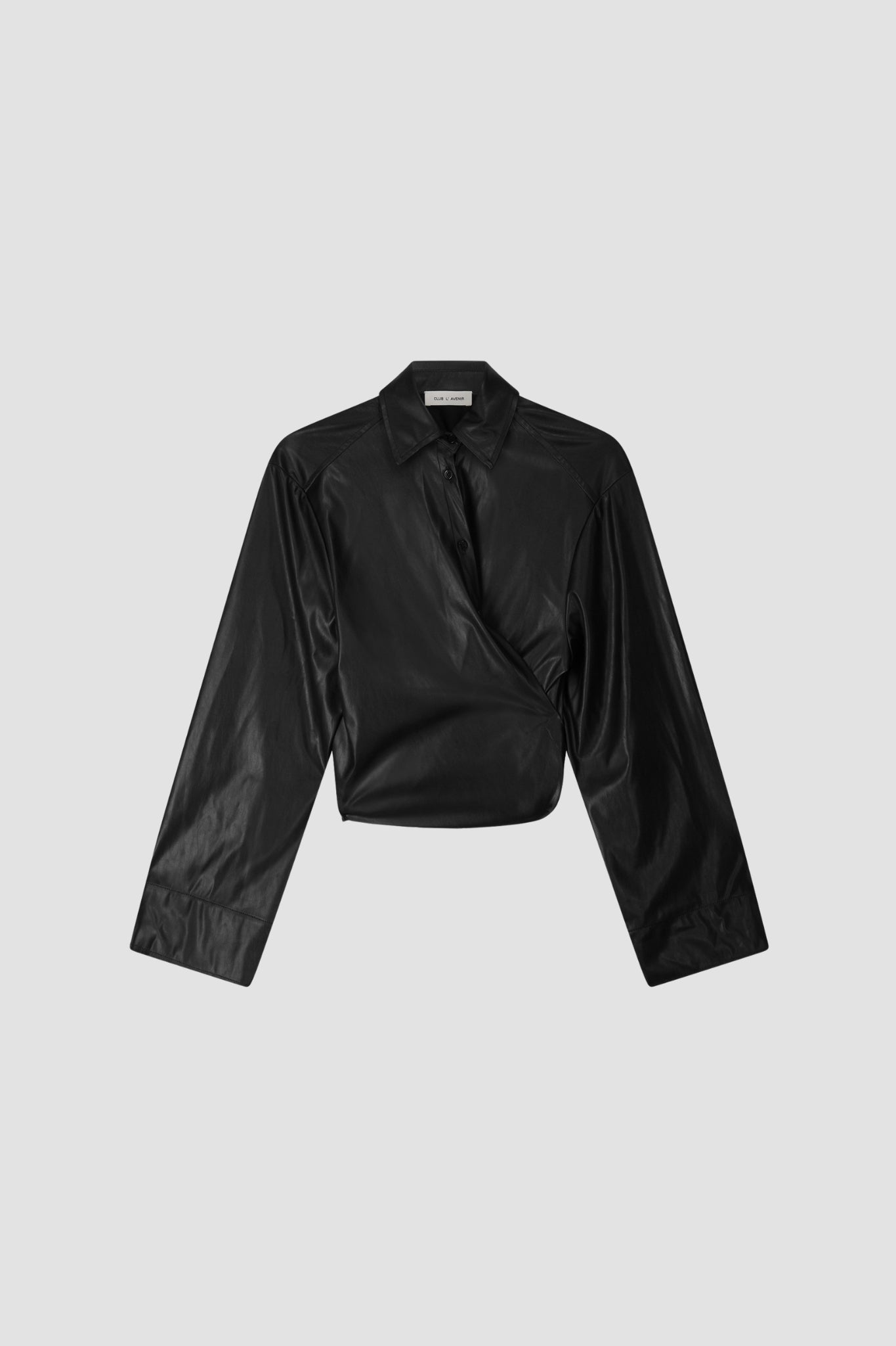 Faux leather wrap blouse, sensual without artifice — back tie to adjust the waist and accentuate the silhouette.