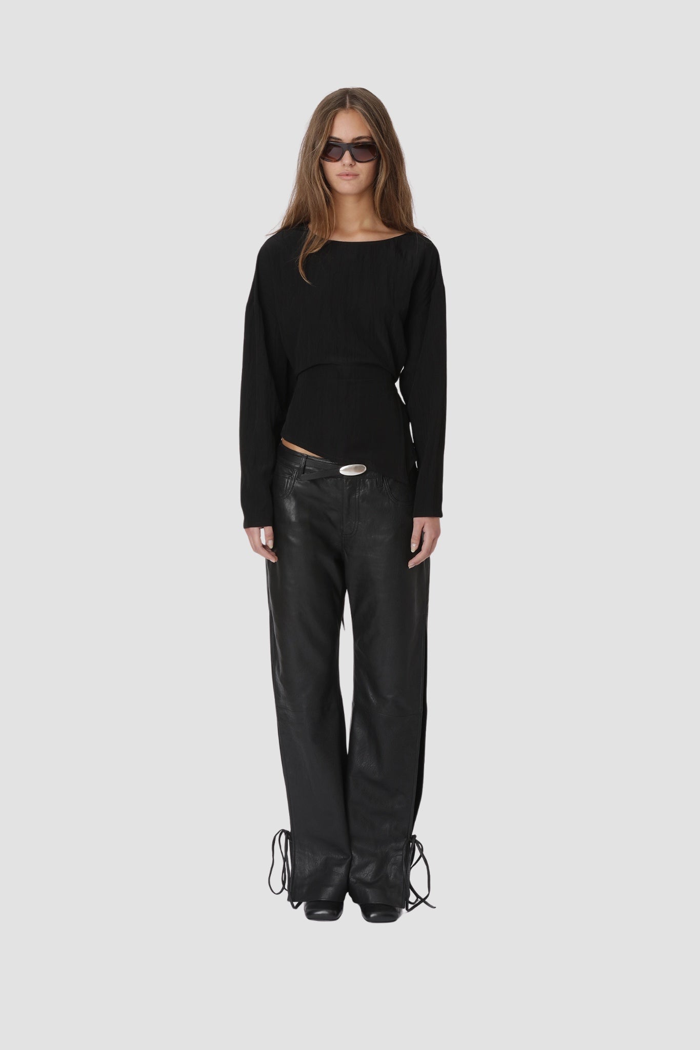 Black oversized top in lightweight rayon and nylon, with a sleek, flowing silhouette. Classic collar, with the option of belting at the back.