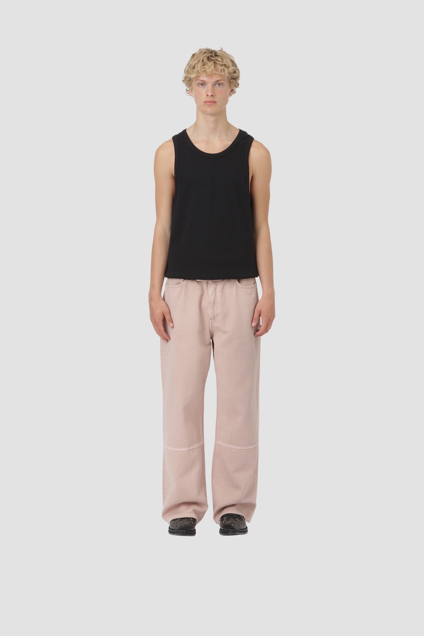 High-waisted wide-leg pants in garment-dyed cotton in a distinctive pale pink color. Featuring a flowing silhouette, patch pockets, and visible seams, they create a look that's halfway between tailored and utilitarian.