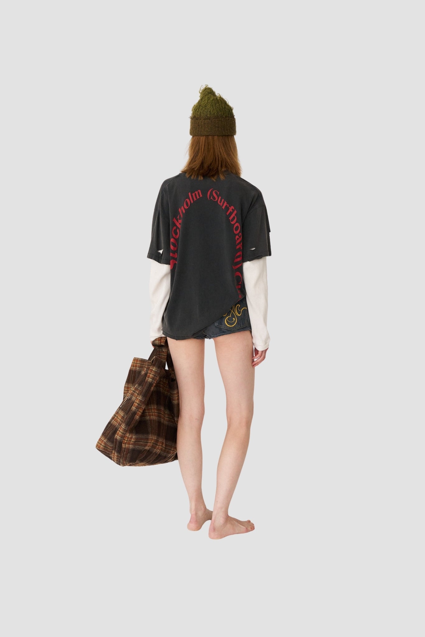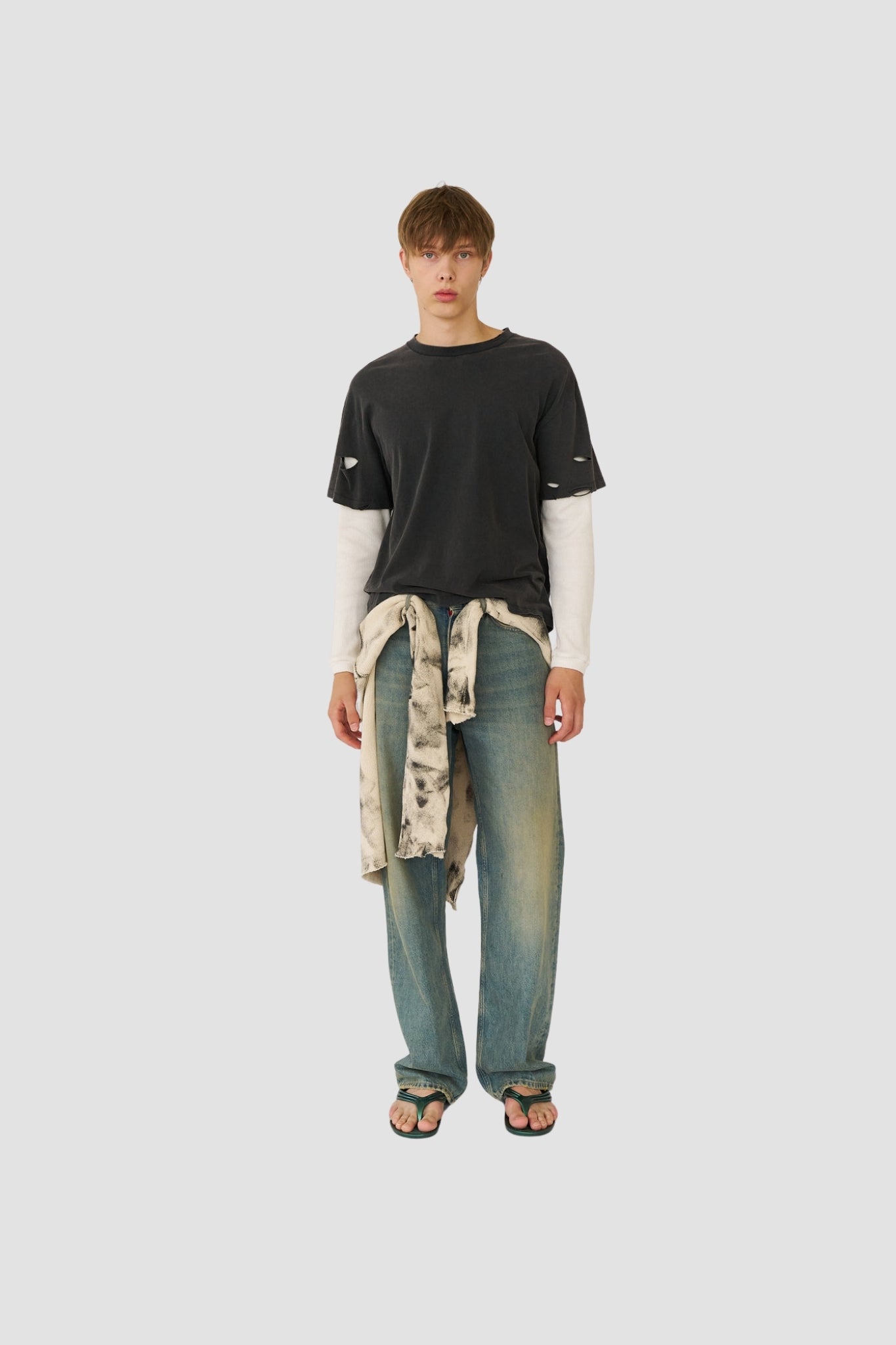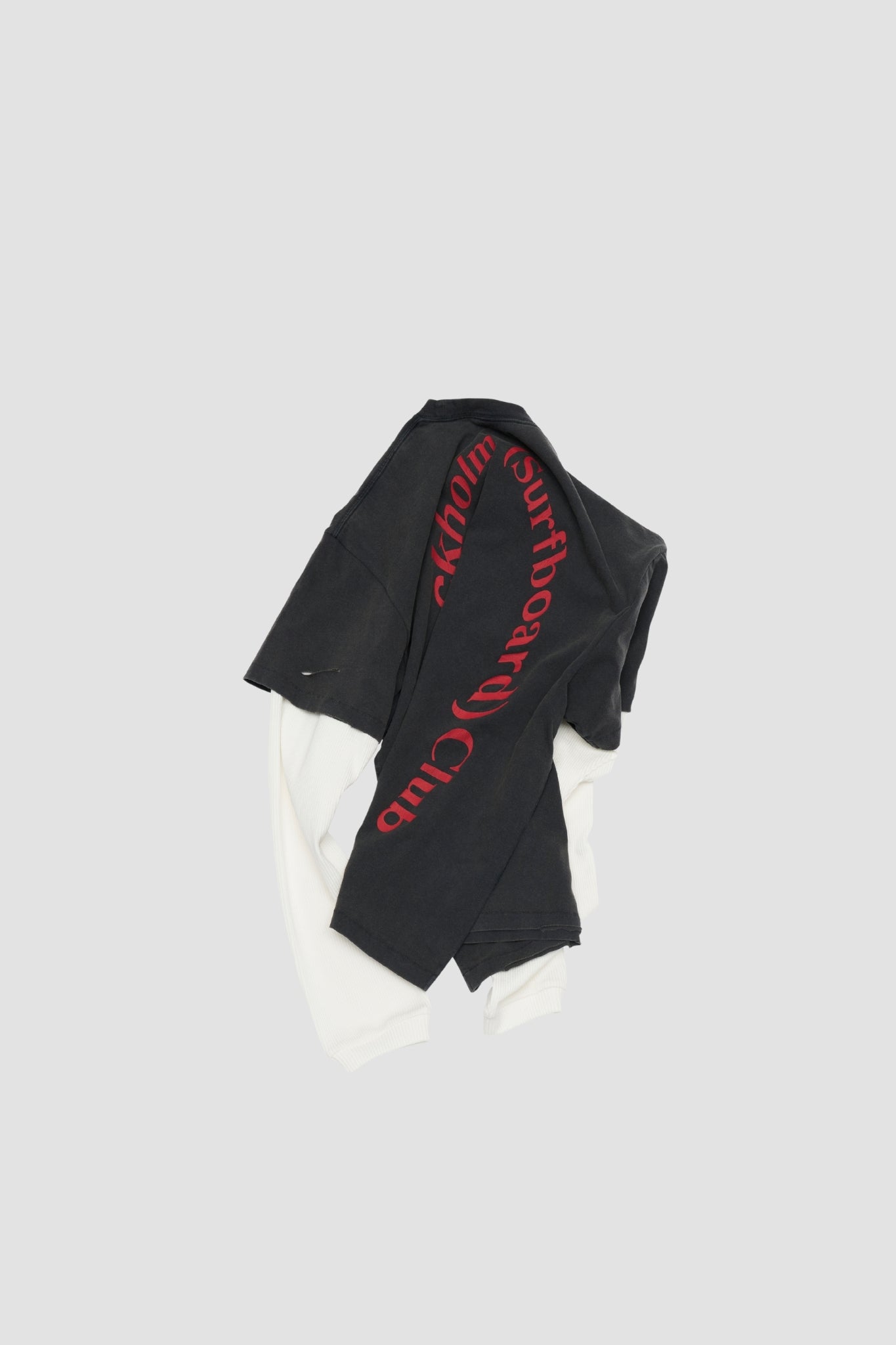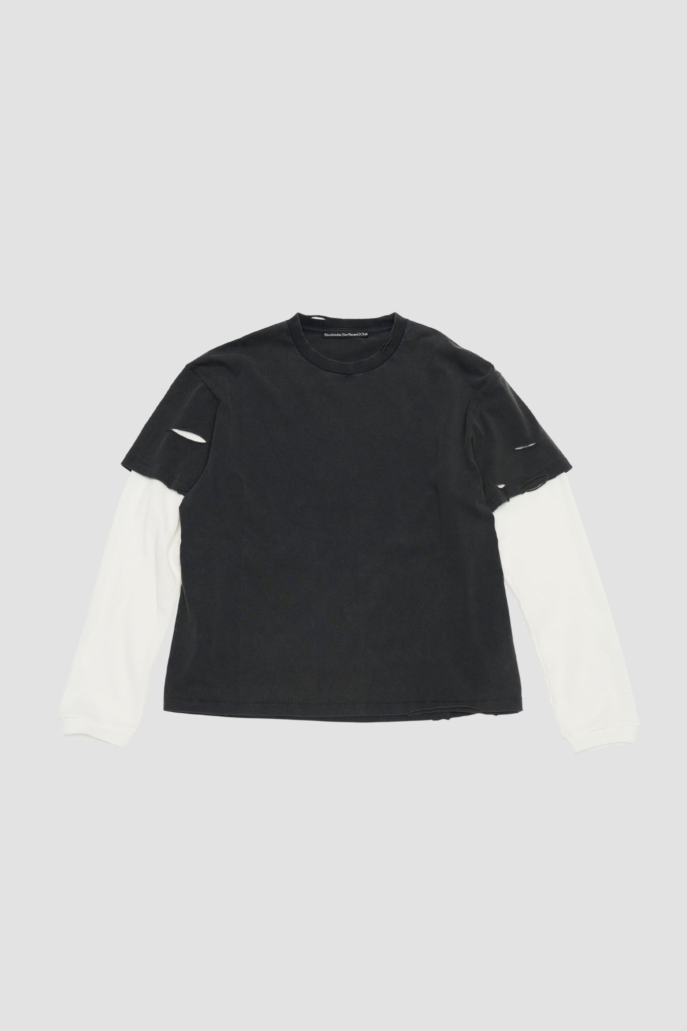 The LAYER BOX TEE Black is a black T-shirt designed for layering. It features a boxy silhouette and premium material.