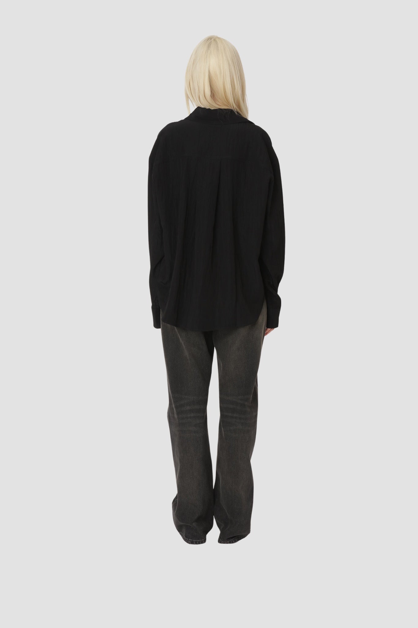 Unisex straight-leg shirt in black technical fabric with a structured drape. Clean finishes, invisible button placket, and a stiff collar. A versatile piece with a utilitarian feel.
