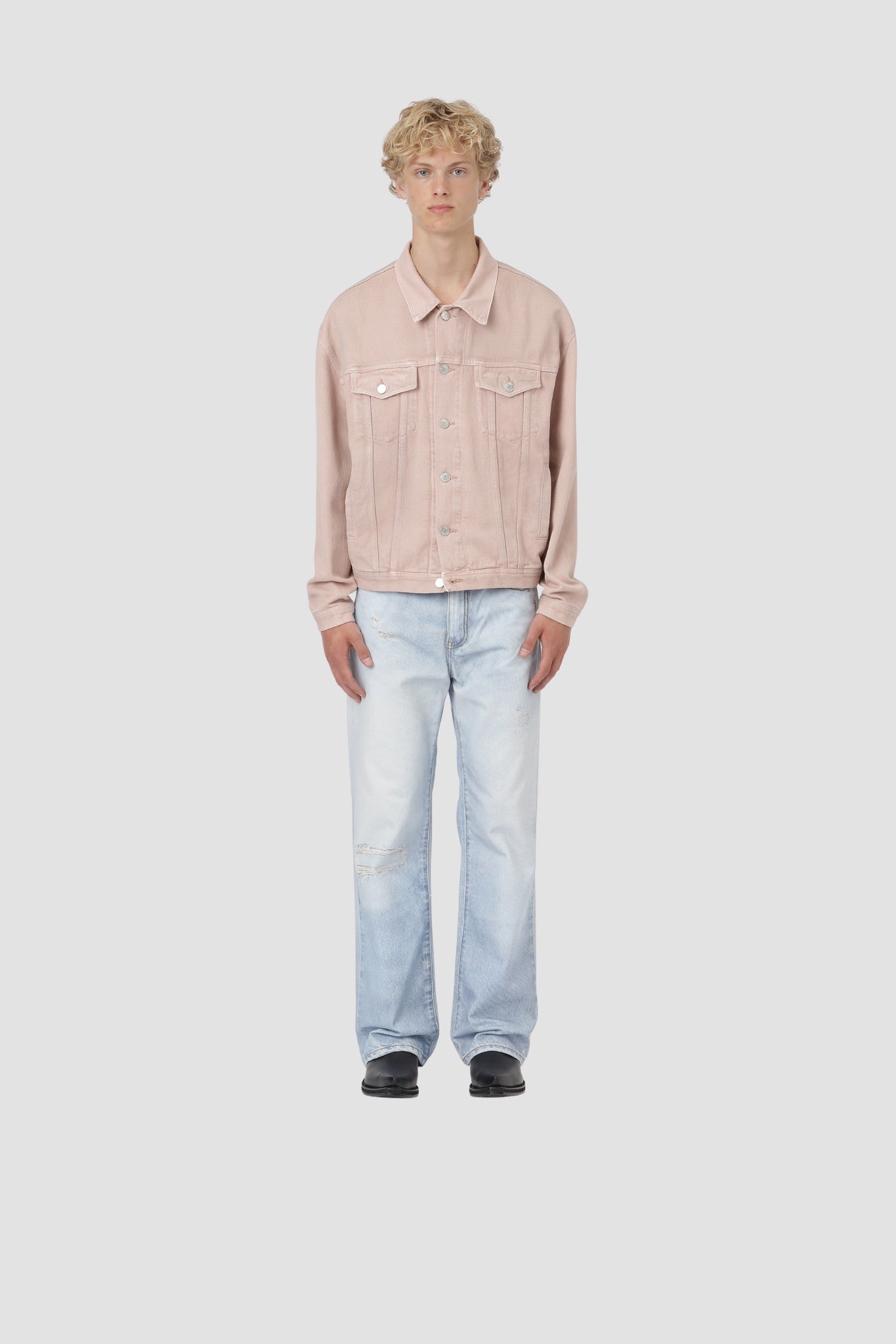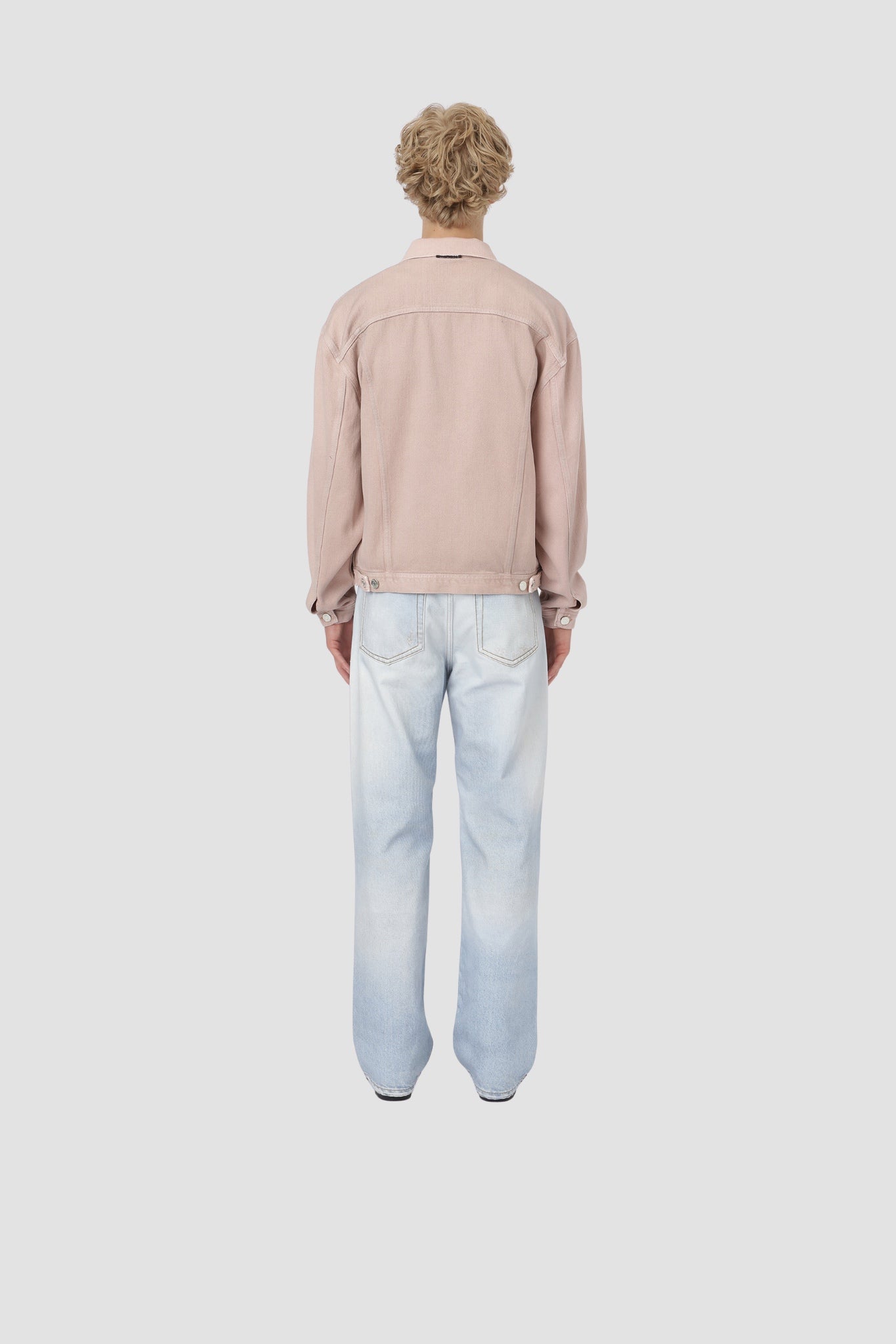 A cropped jacket to match the Las Vegas pants. A smoky pink hue, boxy fit, shirt collar, metal buttons, and two chest pockets. A strong, modern monochrome silhouette.