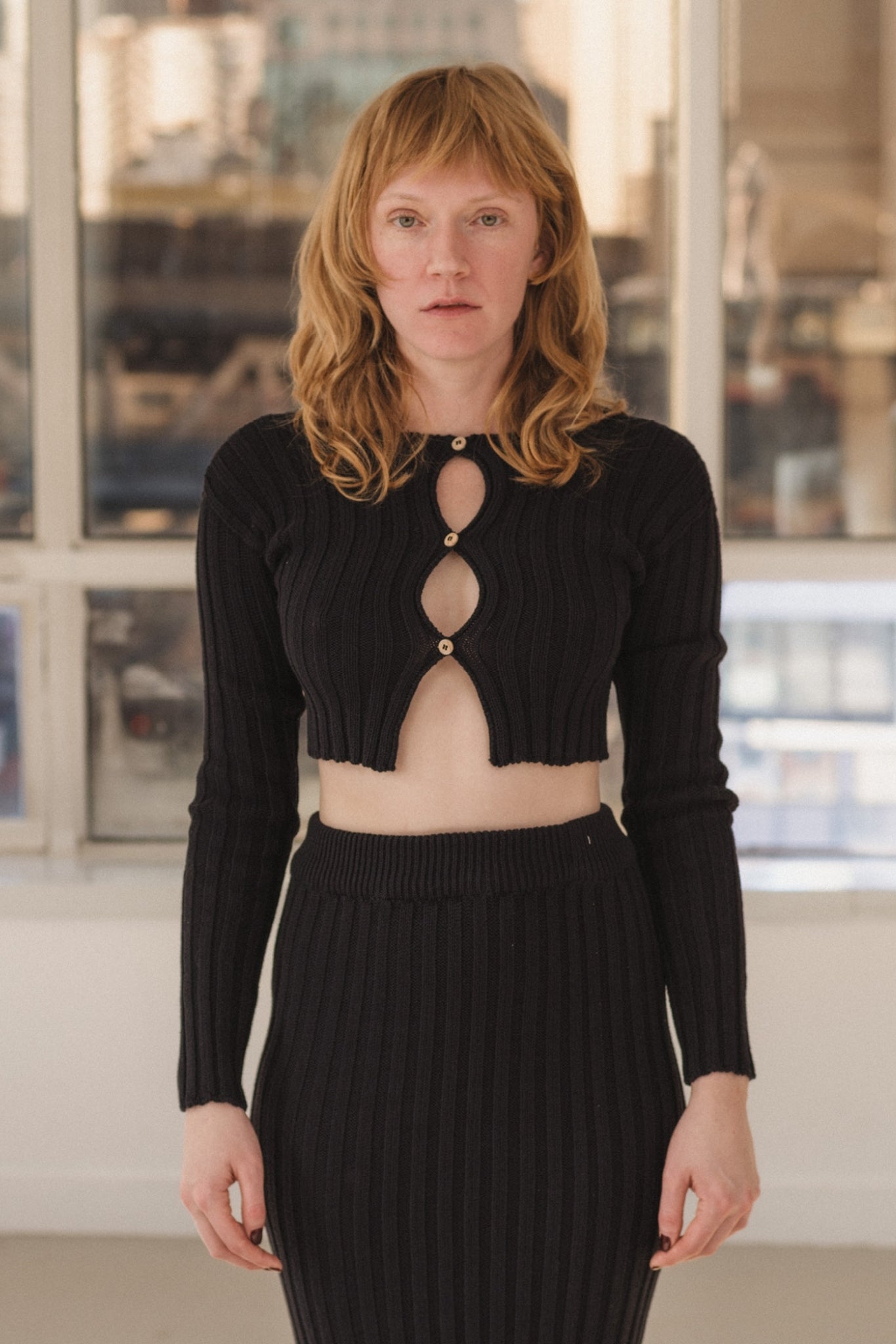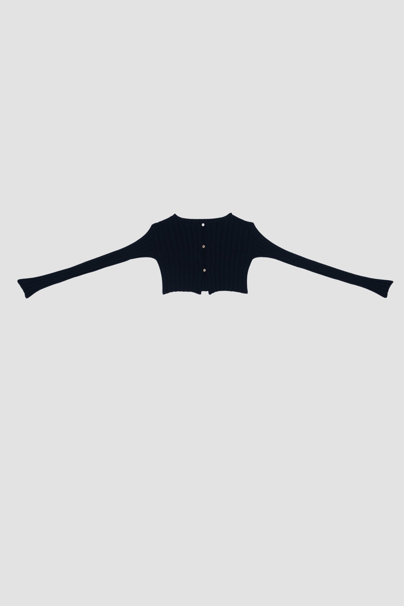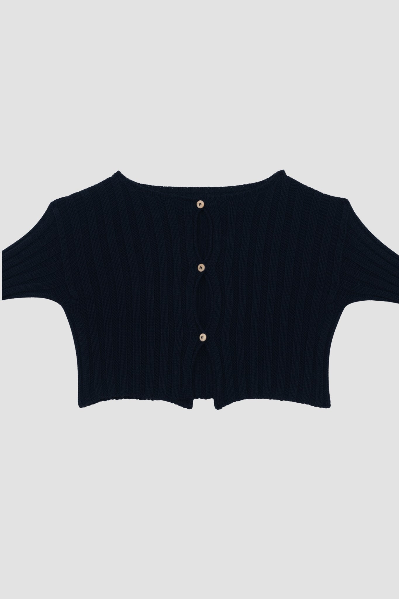 Long cardigan in organic ribbed knit, combining structure and softness. Long sleeves, tone-on-tone buttons, straight cut, easy to wear with a dressy or casual outfit. Made in France in the same workshop as the skirt.