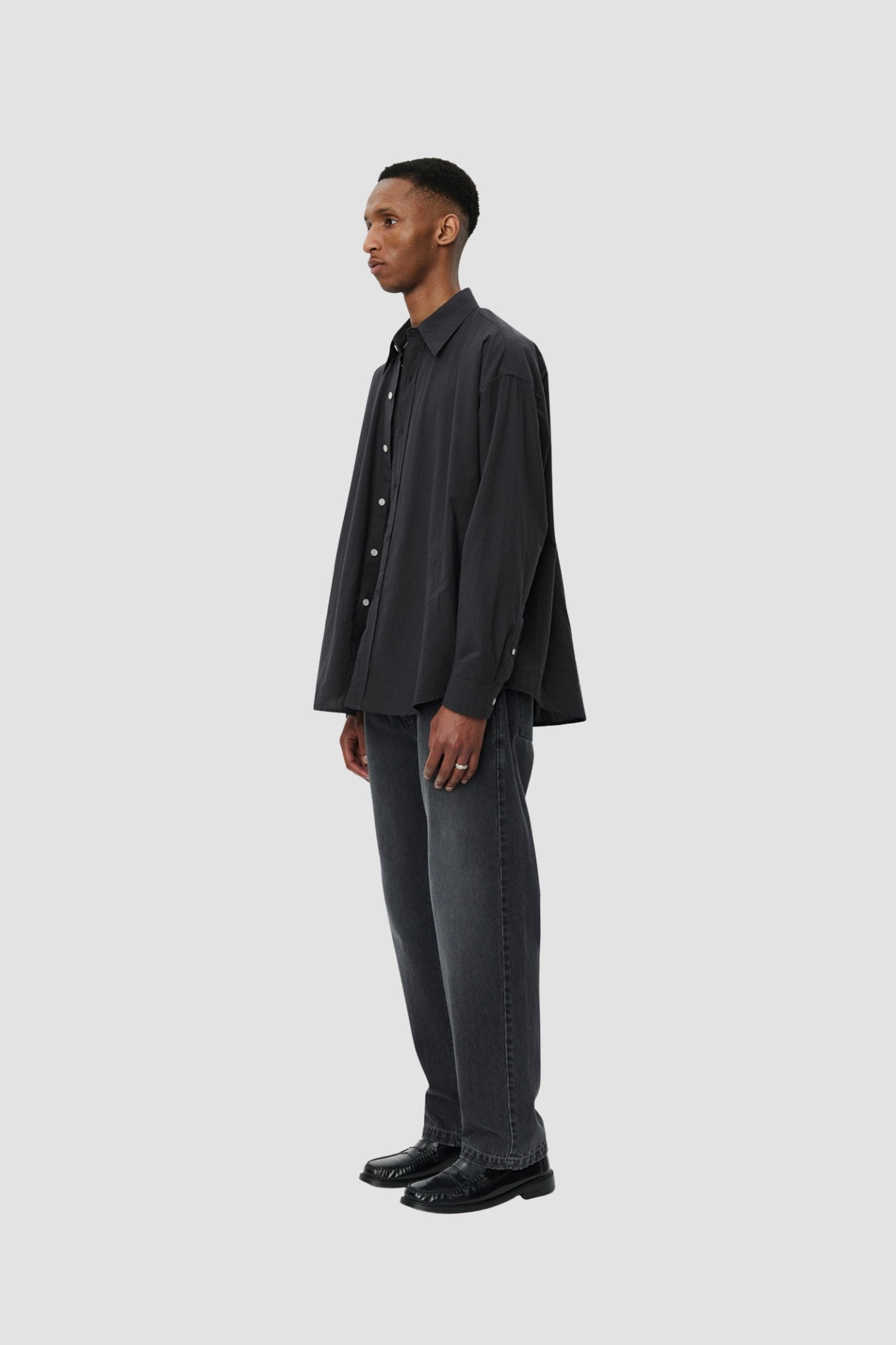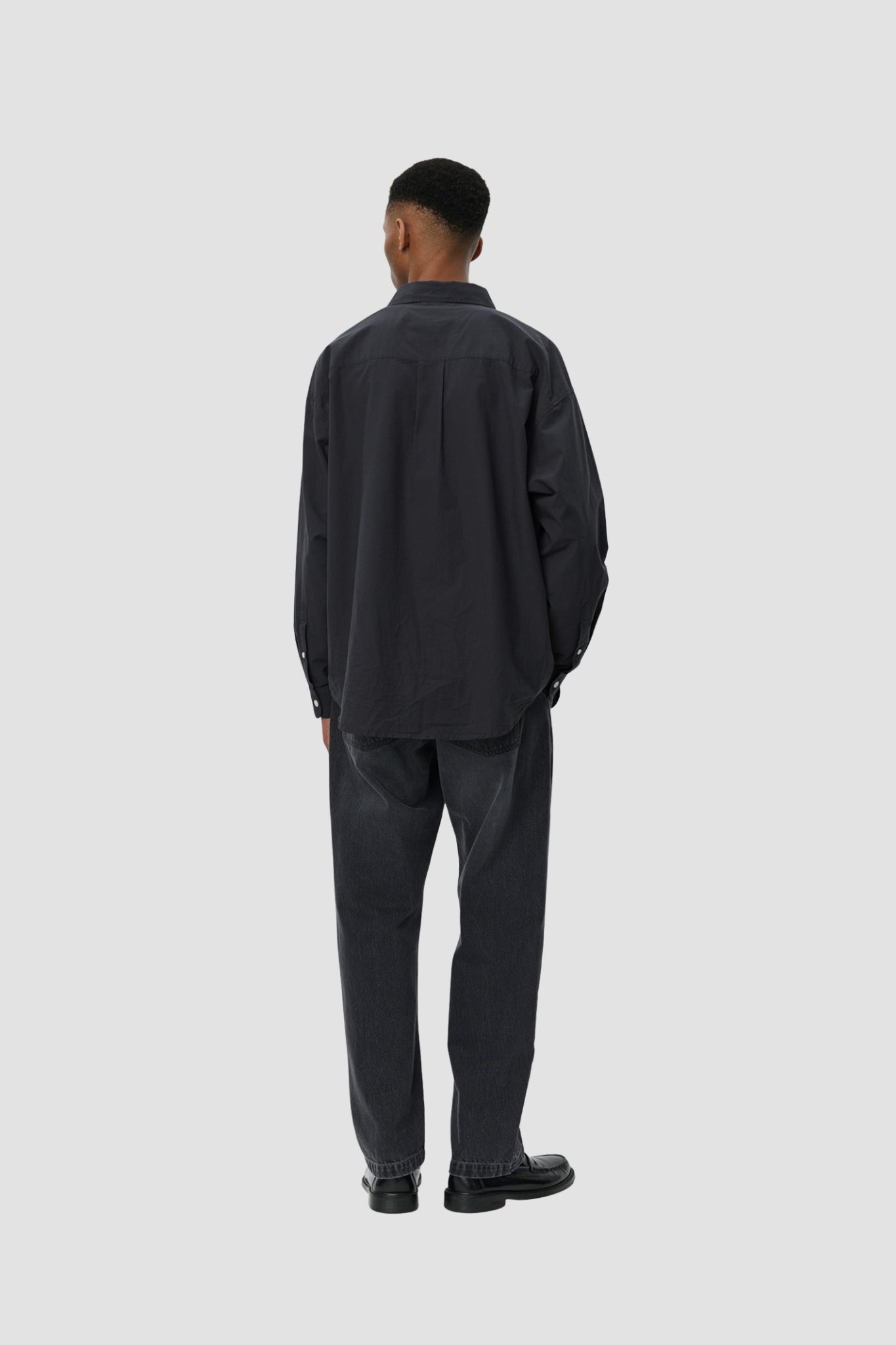 The mfpen Network Shirt features an oversized fit with dropped shoulders and a rounded hem. It features a button placket, pleats at the back yoke, and tonal raw-edge labels at the side seams. Crafted from lightweight cotton with a smooth feel, it features a subtle and elegant tonal gray micro-stripe pattern.