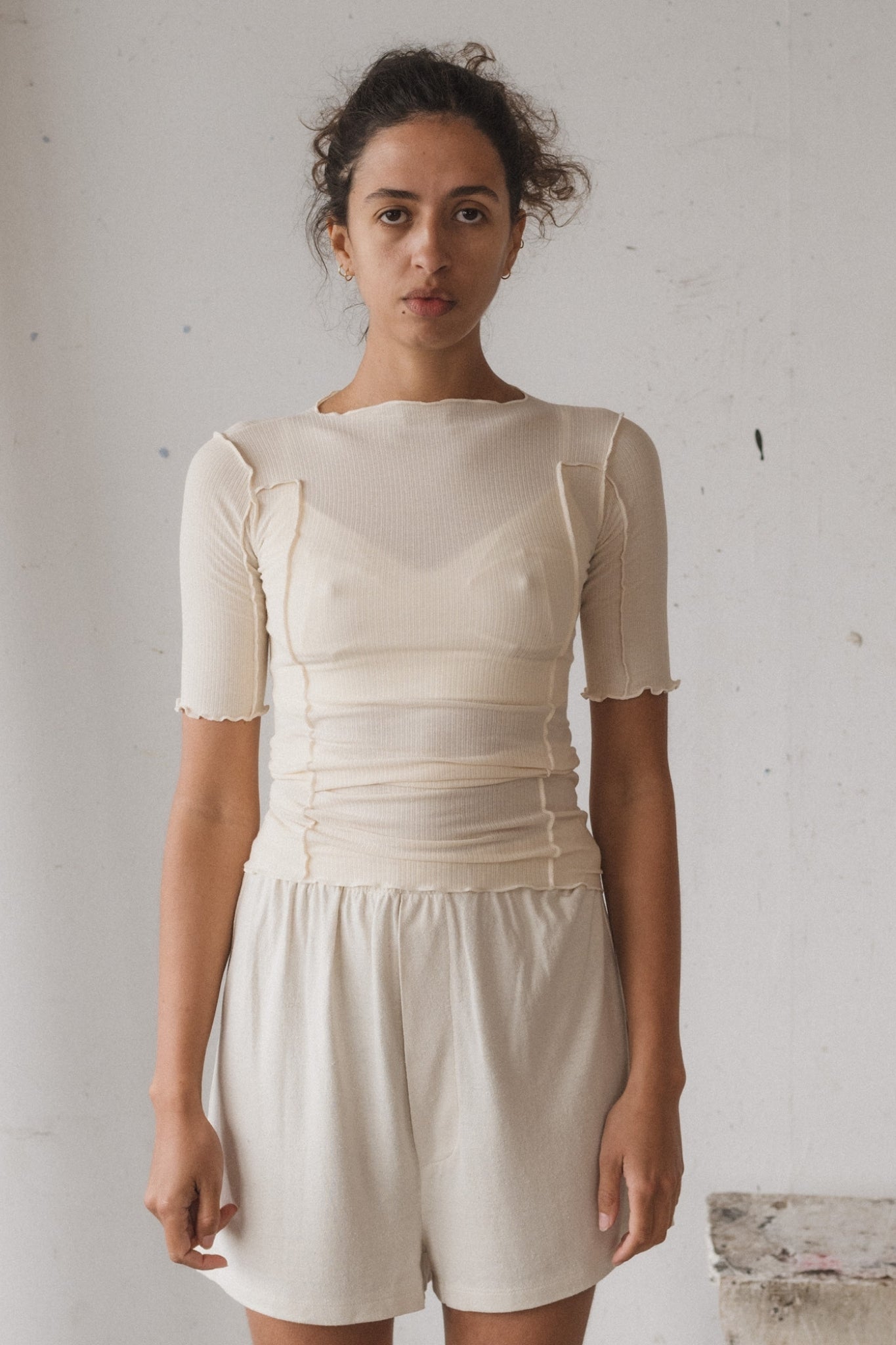 ¾-sleeve top in ecru organic cotton jersey, fitted silhouette and simple neckline. A versatile essential, easy to mix and match with any outfit.