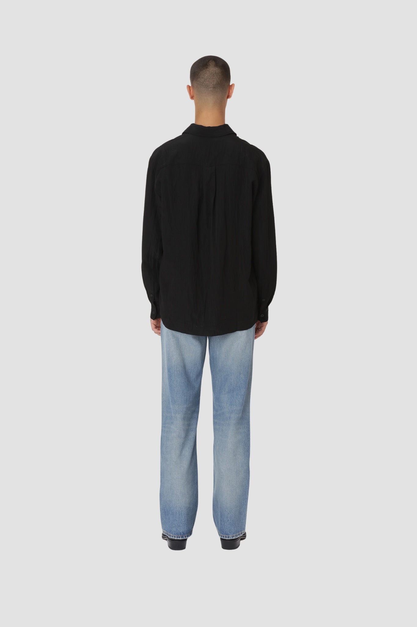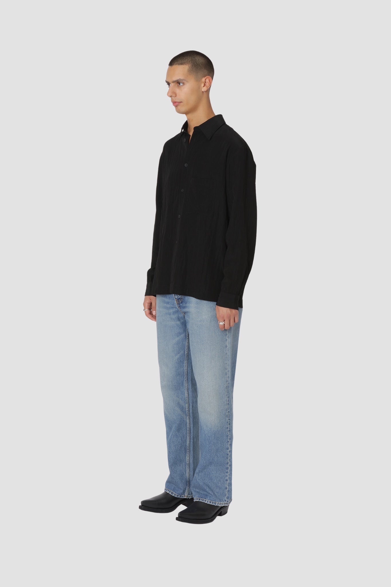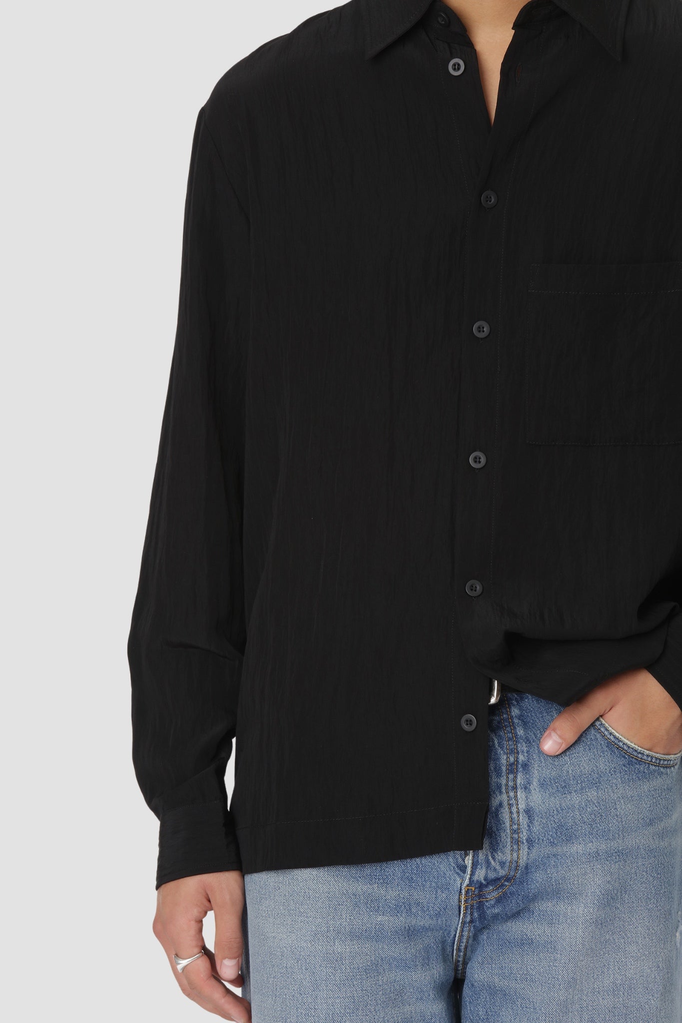 Loose-fitting black shirt with short sleeves, made from a smooth technical fabric. Featuring a Cuban collar and a relaxed fit, it's ideal for warmer days or layering.