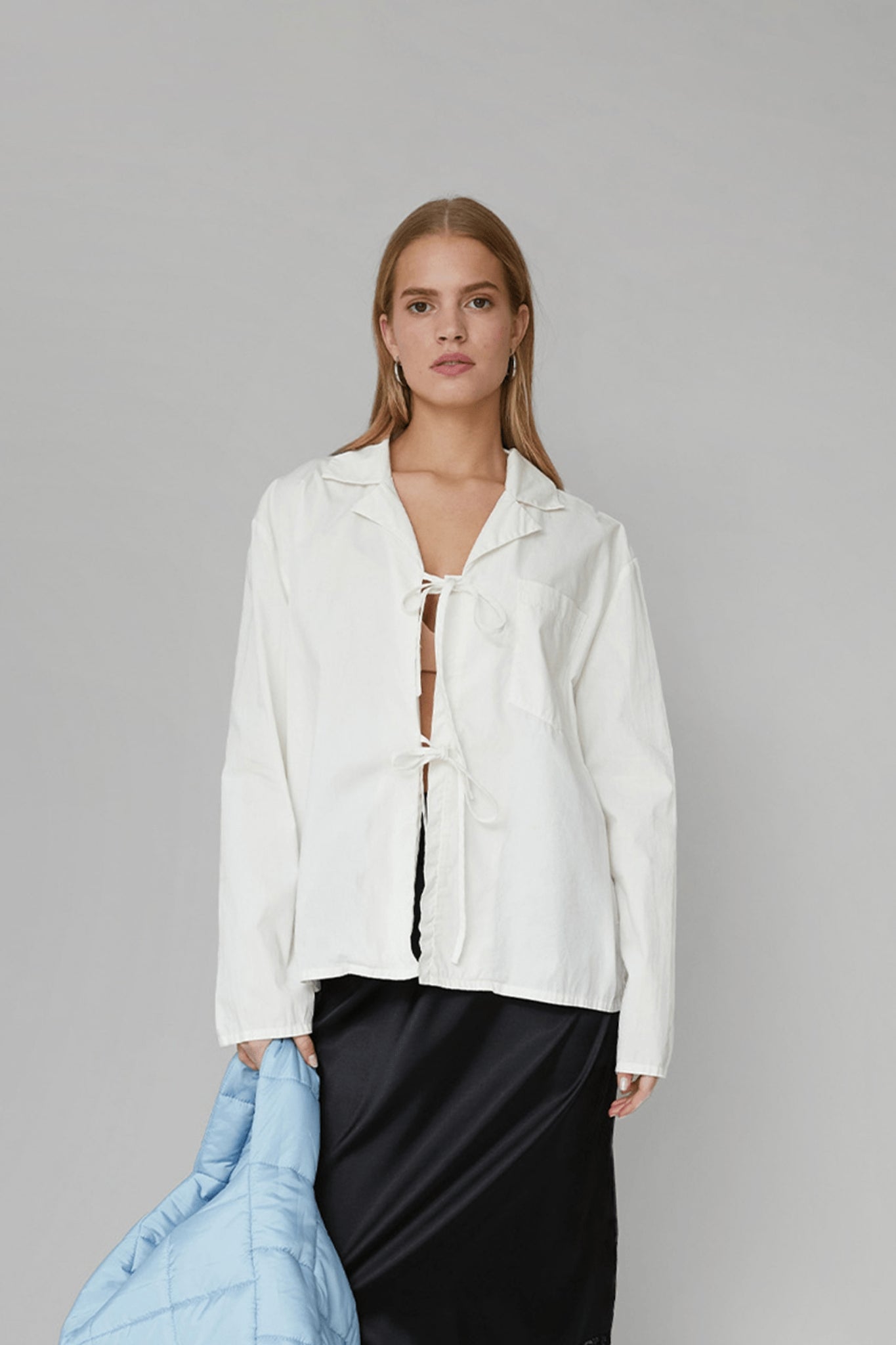La chemise Tavon en coton blanc est une pièce versatile à la coupe droite. Avec son col classique et ses attaches nouées, elle apporte structure et élégance à toute garde-robe.