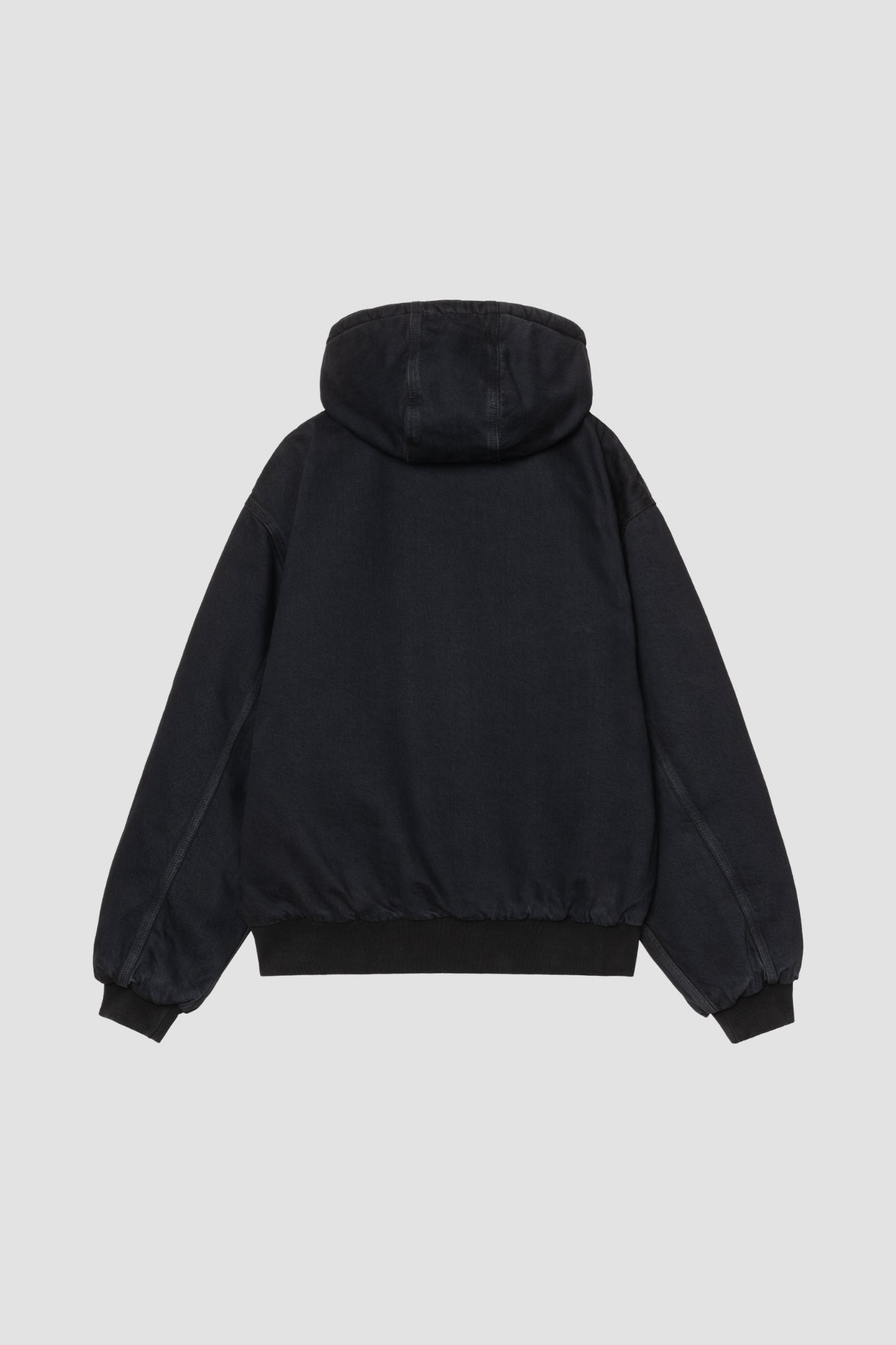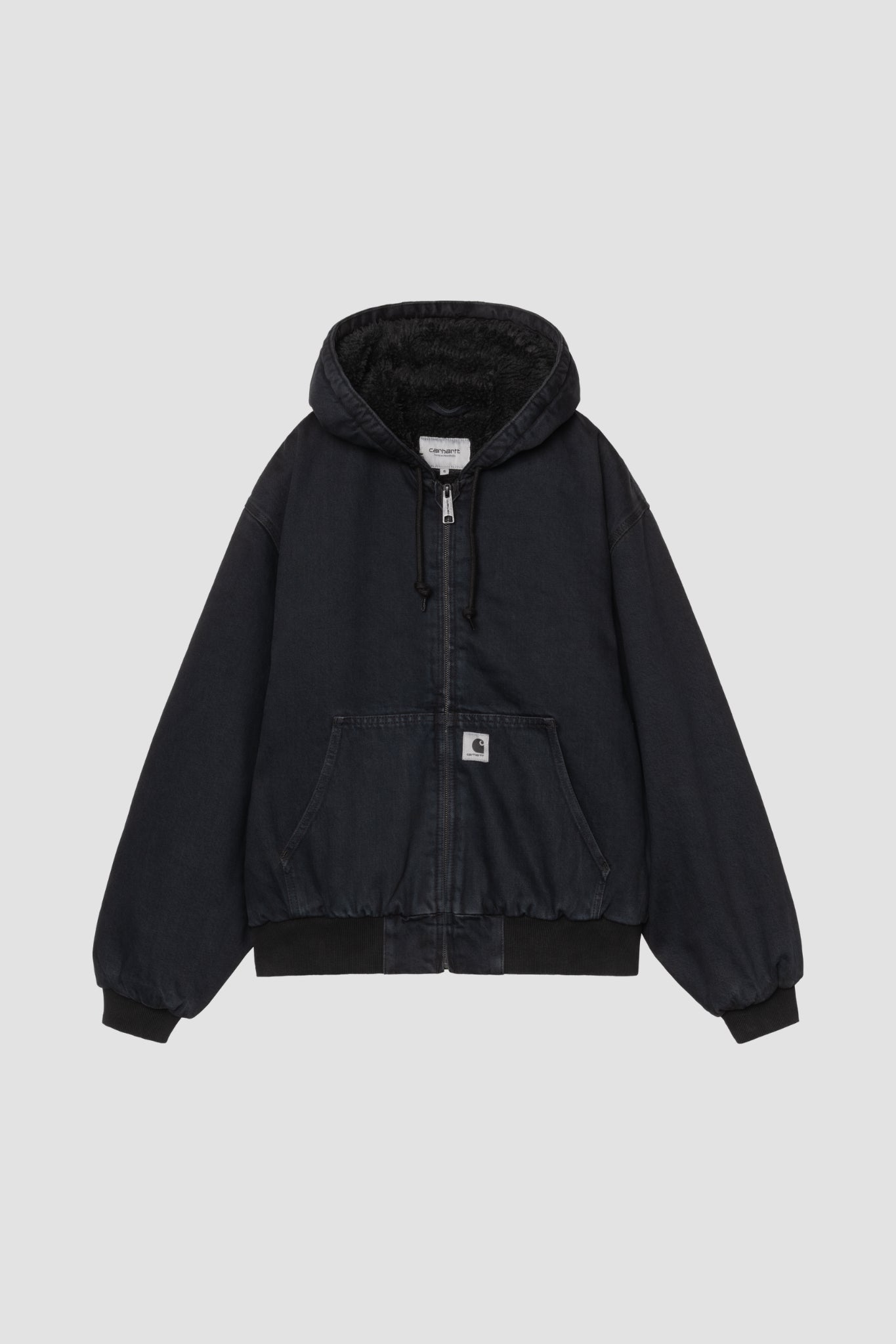 Women's zip-up jacket inspired by Carhartt classics, in Blue Midnight Wash faded denim. Quilted lining, integrated hood and rugged finishes for a revisited workwear style.