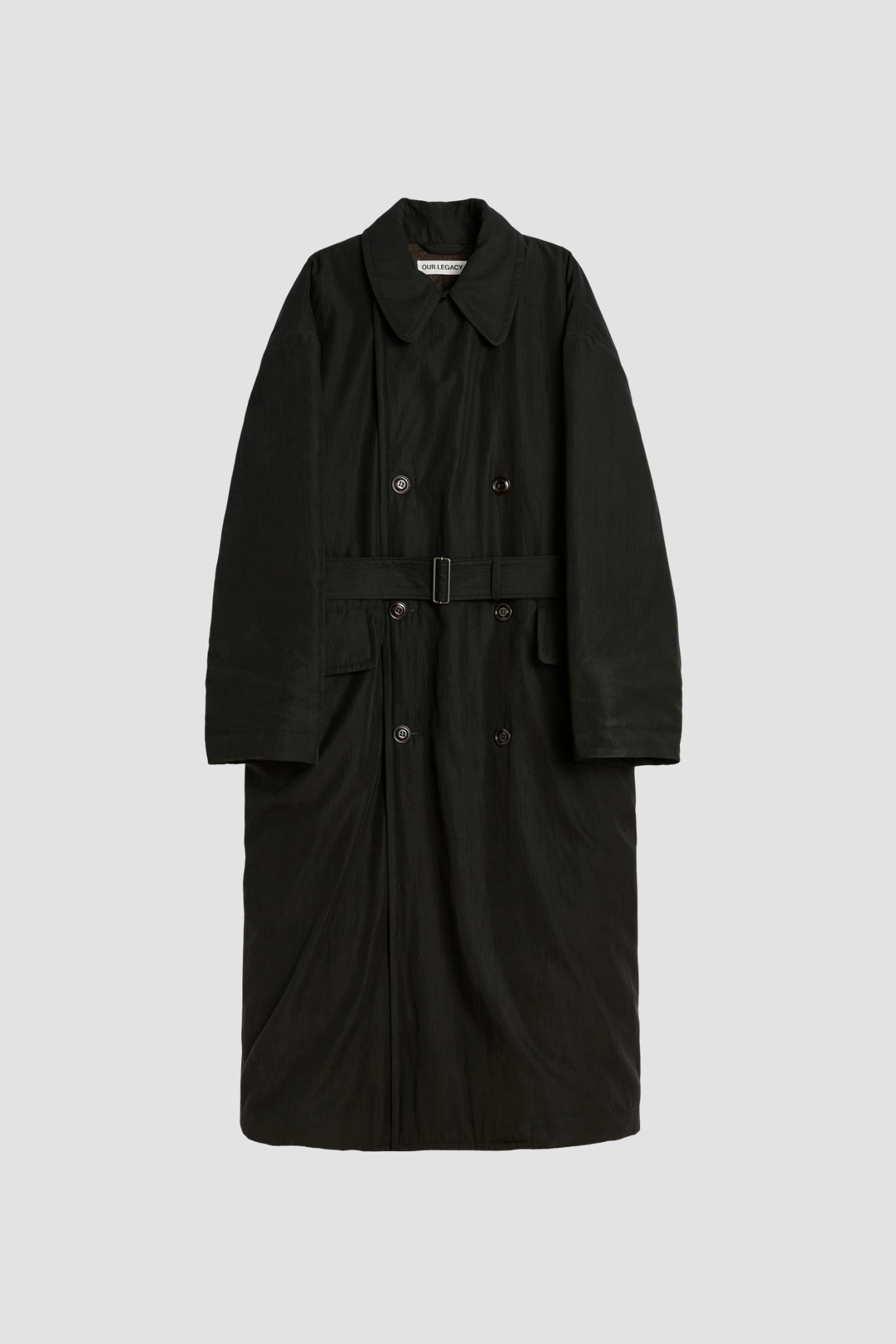 Le Duvet Trench réinterprète le trench-coat classique avec une allure moderne : silhouette oversize, doublure matelassée enveloppante, détails de coupe technique sur une toile légère noir profond façon duvet.
