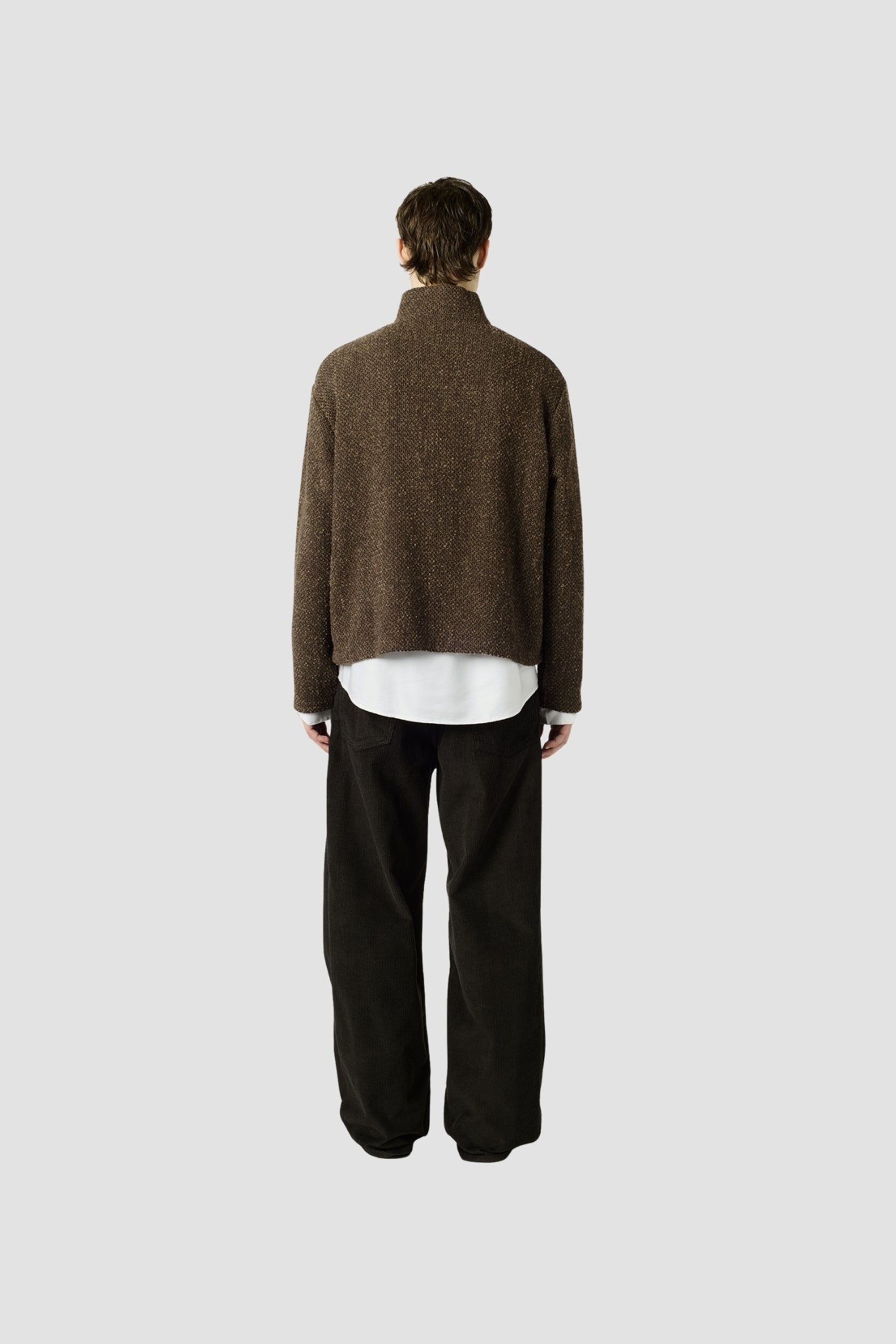 Polo zippé en maille fine texturée, coloris brun à bouclettes discrètes. Le Shrunken Polo arbore une coupe ajustée et courte, avec col classique et finitions côtelées. À porter comme une seconde peau.
