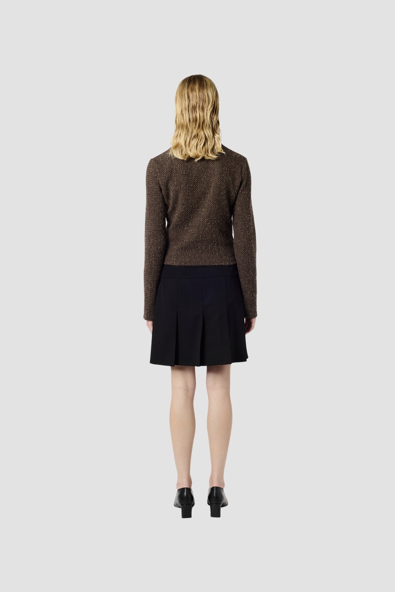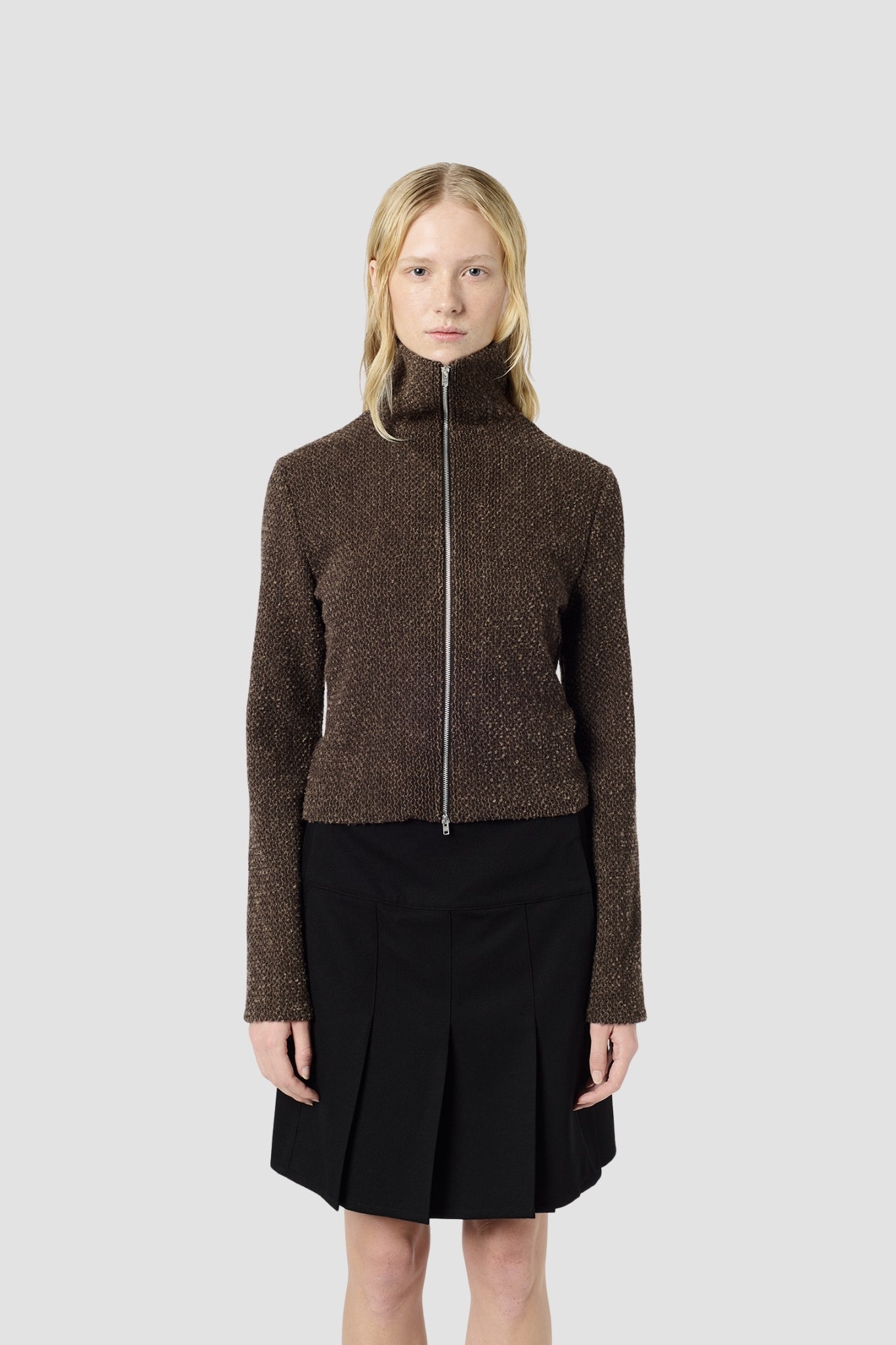 Haut zippé en maille légère brun texturé à bouclettes. Le Slim Zip Longsleeve présente une coupe cintrée, un col montant et une fermeture zippée intégrale, parfait sous une veste ou en pièce forte.