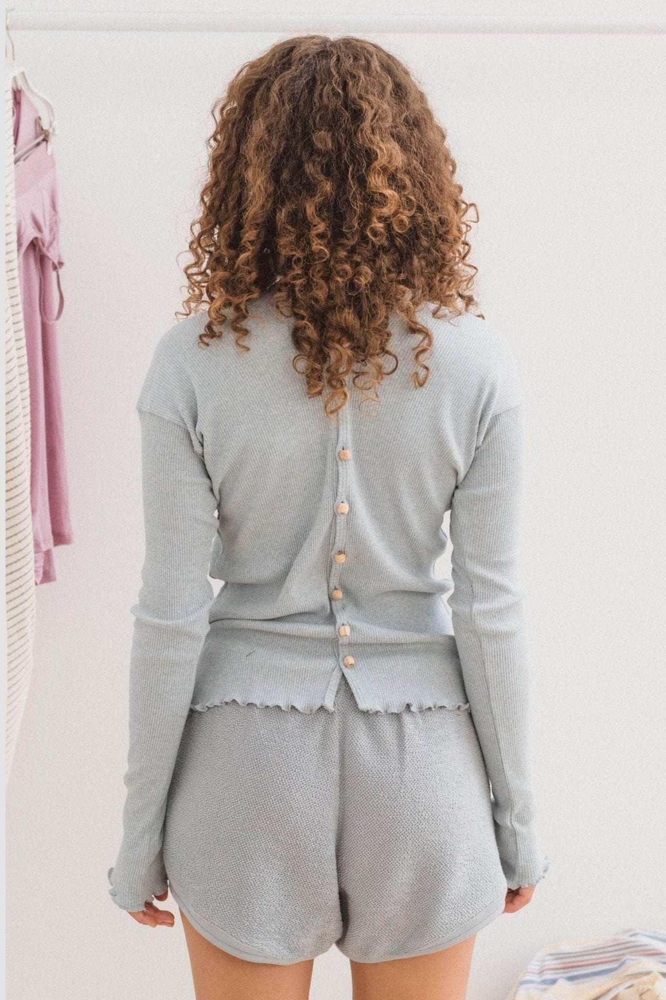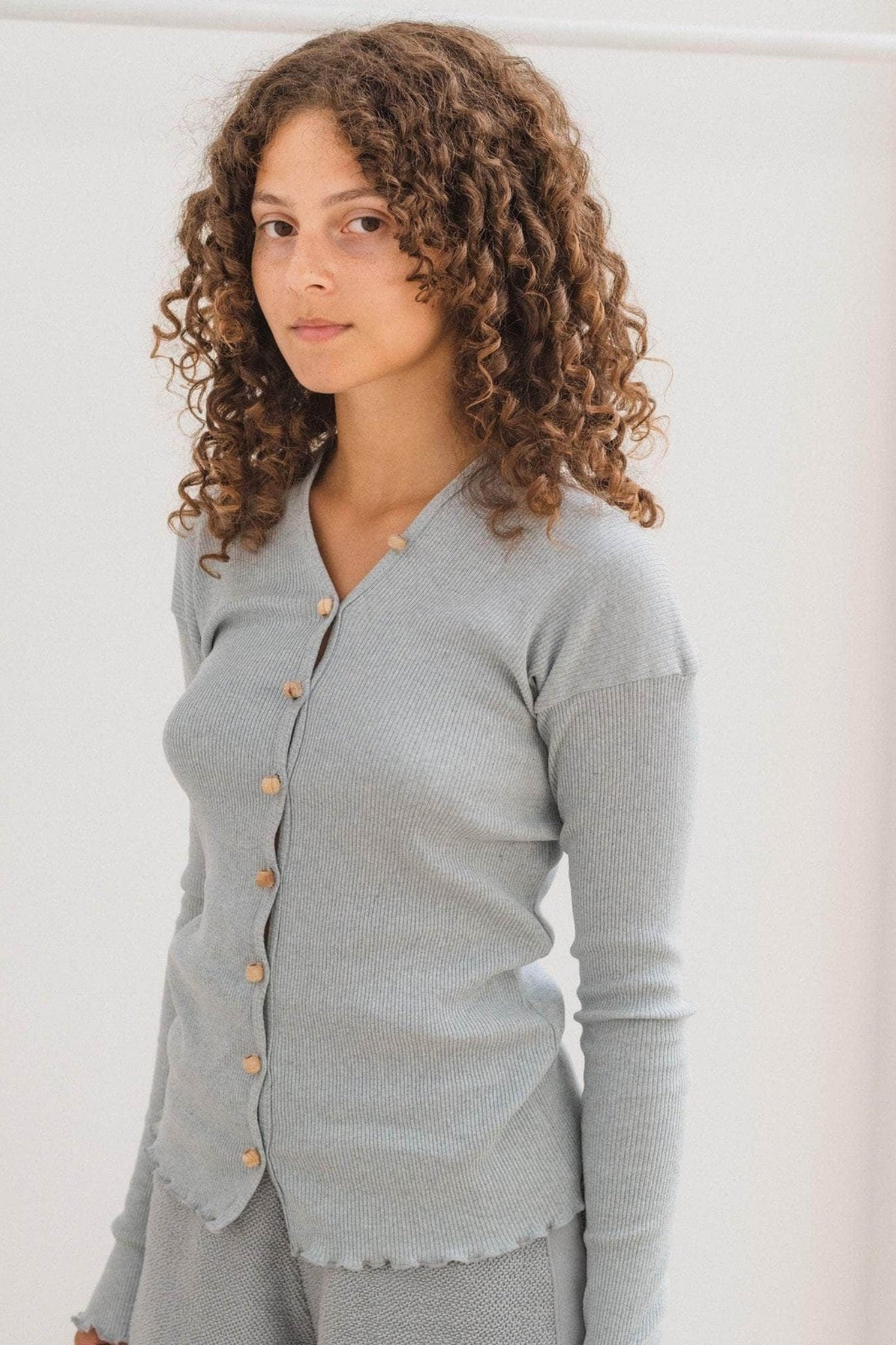 Le cardigan TAV en teinte Hardin Blue est confectionné en côte de coton recyclé, offrant une coupe confortable avec des boutons-pression sur le devant.