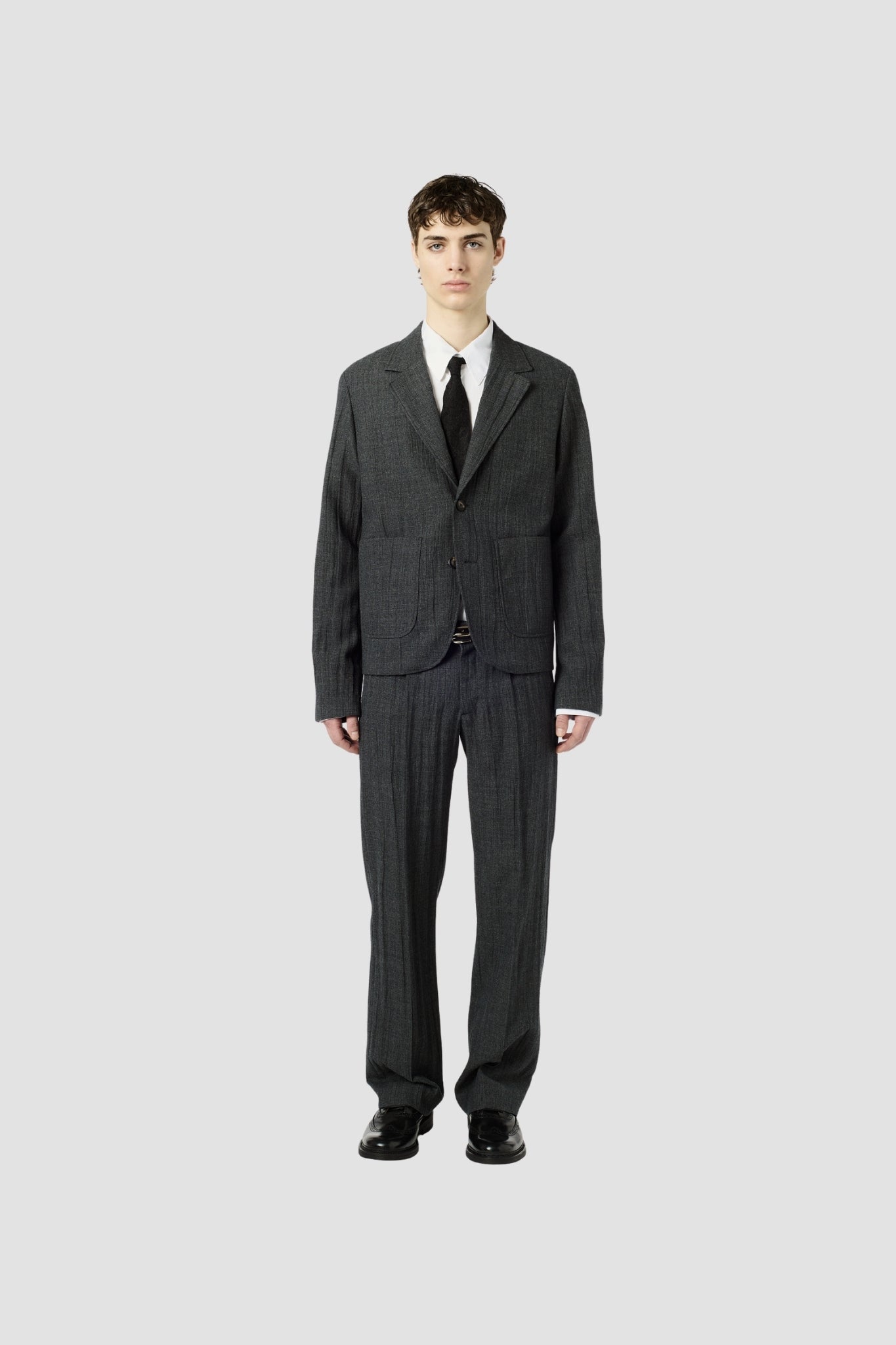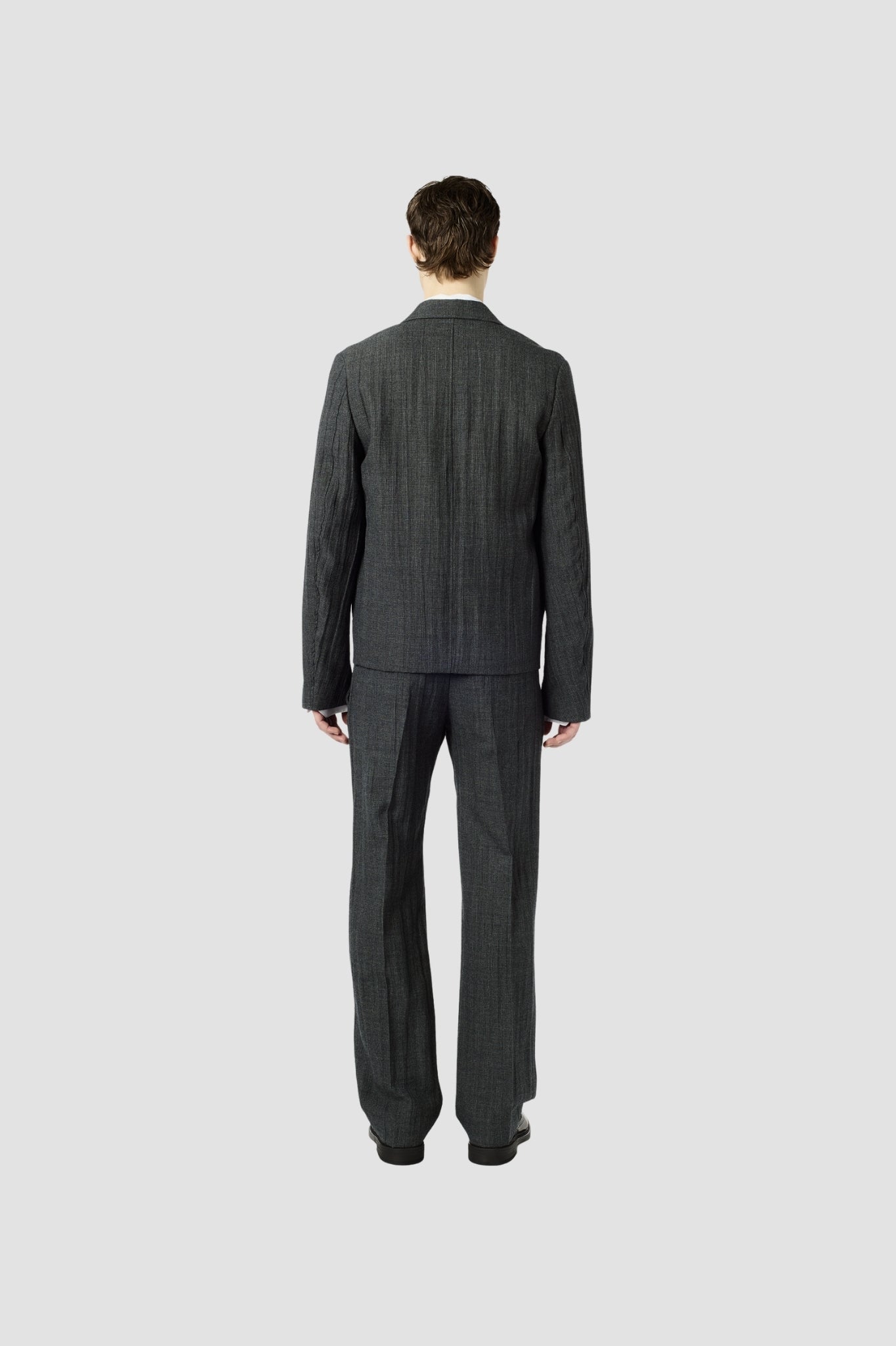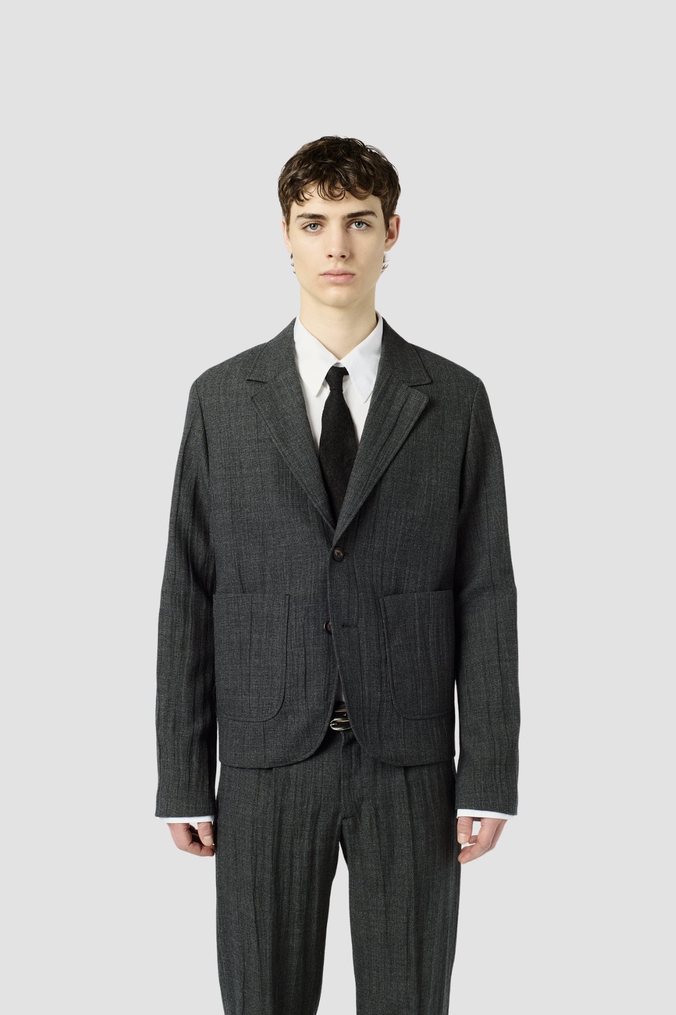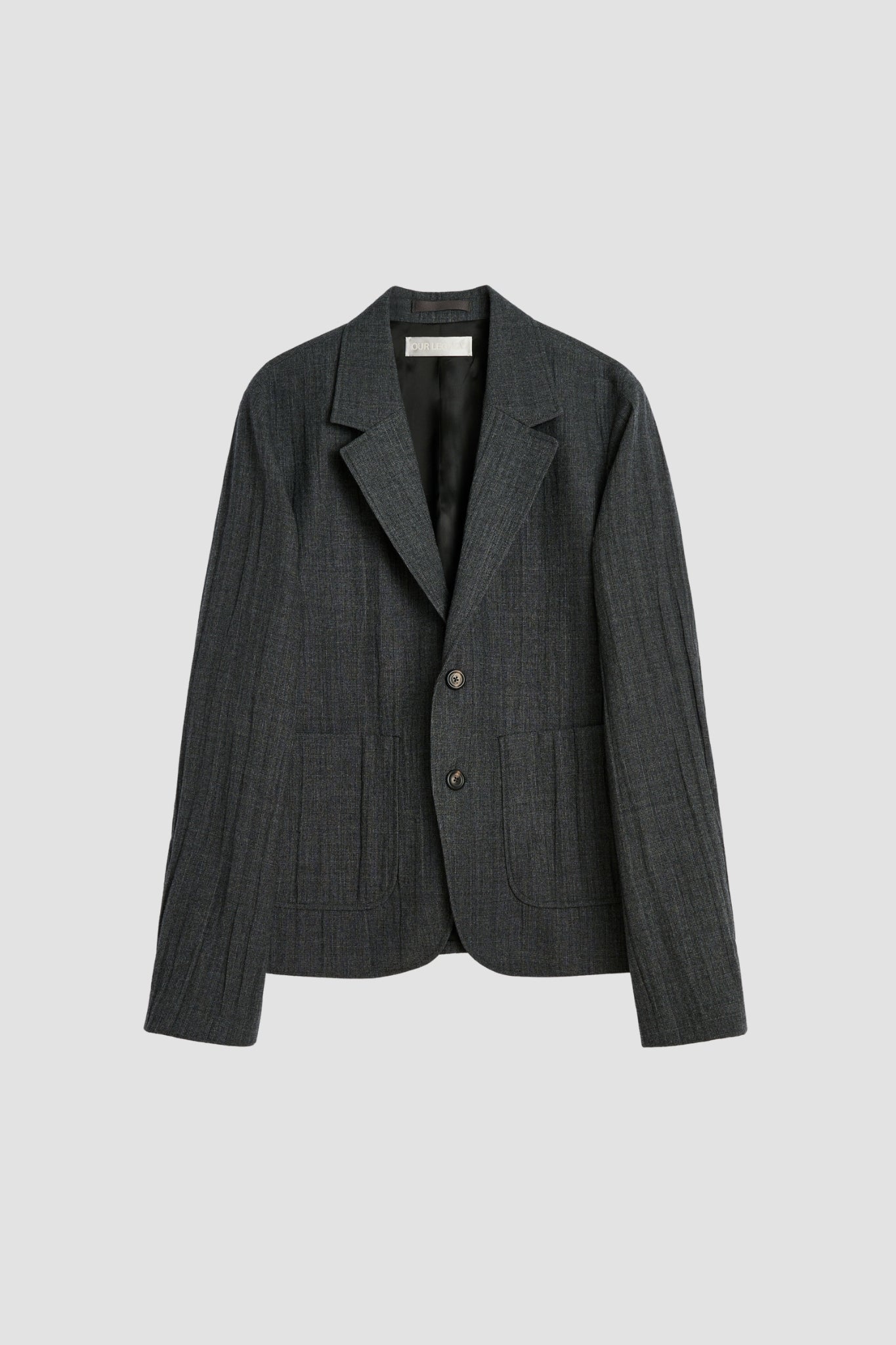 Blazer souple en laine plissée gris pierre. Le Temp Blazer se distingue par sa texture singulière, sa construction non doublée et sa coupe légèrement oversize, idéale pour un vestiaire contemporain et fluide.
